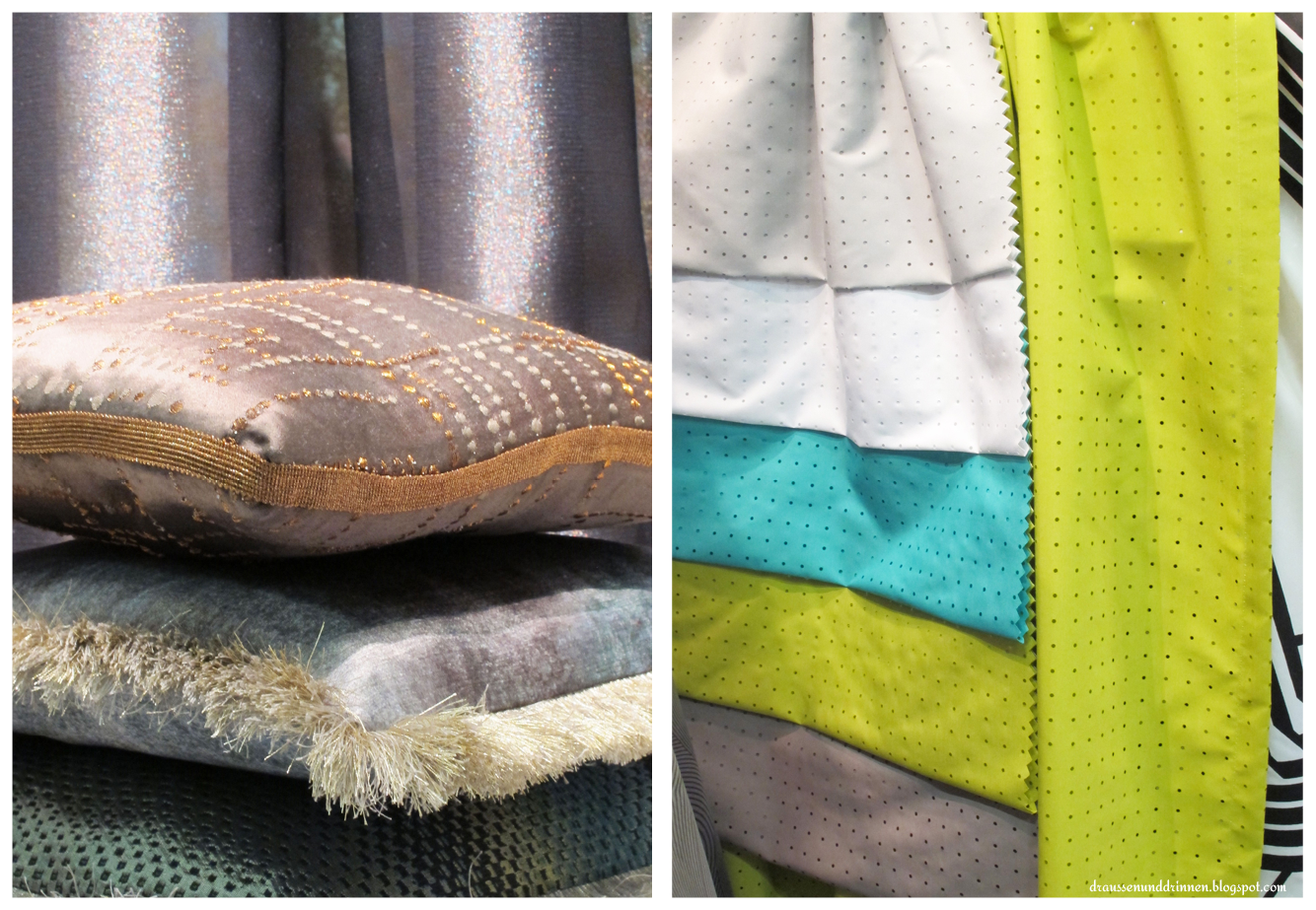 Am Stand von Nya Nordiska hatte ich dann ein echtes Aha-Erlebnis. Ich blieb nämlich zunächst stehen, weil eine Ecke des Standes komplett mit ziemlich schwer und barock wirkenden Stoffen dekoriert war. Mit viel Glitzer, Troddeln, Bommeln und Fransen. Hui … und das ist jetzt wirklich Trend? Ja! Unter Anderem.