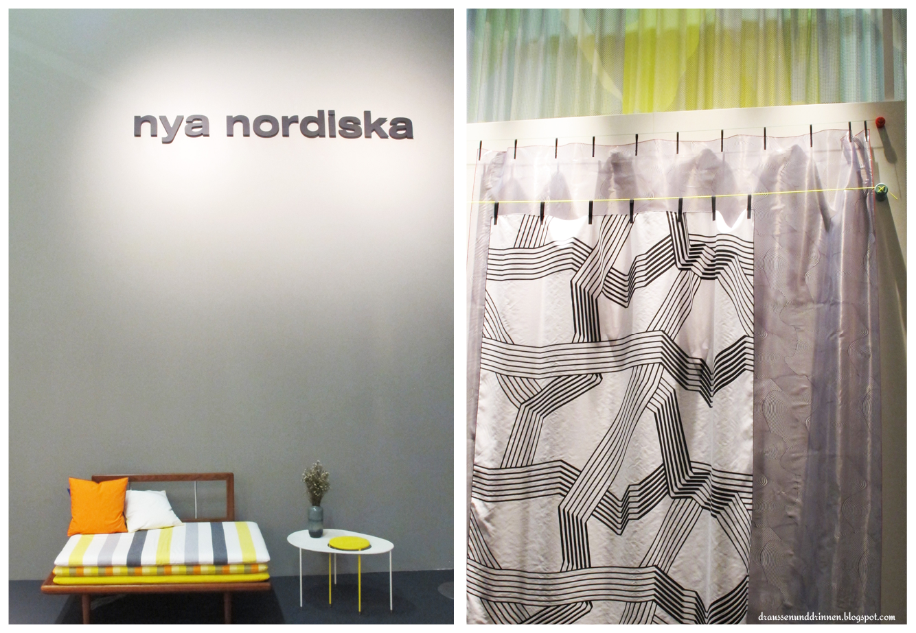 Ein sehr freundlicher Mitarbeiter von Nya Nordiska klärte mich auf: Die Trends bei Dekorationsstoffen werden nicht etwa von der Modebranche diktiert. Nein, denn die gingen einfach viel zu schnell wieder vorbei. Da lohnt sich die Investition in Dekostoffdesigns gar nicht erst. Der echte Maßstab ist die Automobilbranche. Ja, wirklich! Autos! Angeblich sind in der Innenausstattung von Autos gerade edle Stoffe, Glitzer und ein wenig mehr Pomp total angesagt. Kann ich zwar als überzeugte Radfahrerin nicht bestätigen, aber wenn er das sagt, wird’s wohl stimmen. Naja, mein Ding sind solche Designs nicht – hab ich dann auch frei raus gesagt und zack: der nette Mitarbeiter geht mit mir um die Ecke und da sind auch endlich die schönen Stoffe! Also jedenfalls für mich schön! Frisch, leicht, tolle Oberflächentexturen nicht zu schwer in der Verarbeitung. Einfach nur schön!